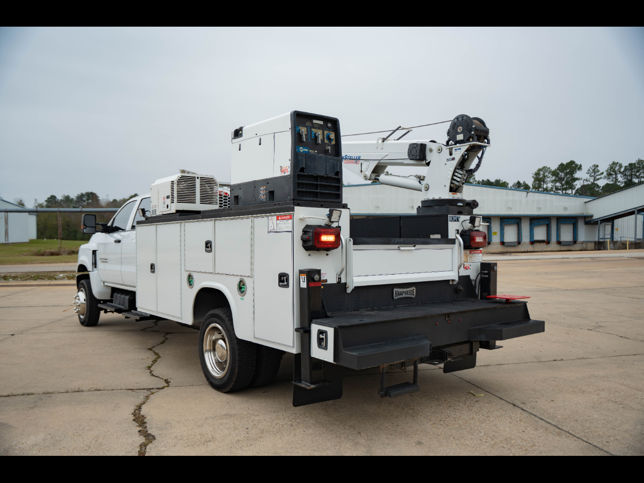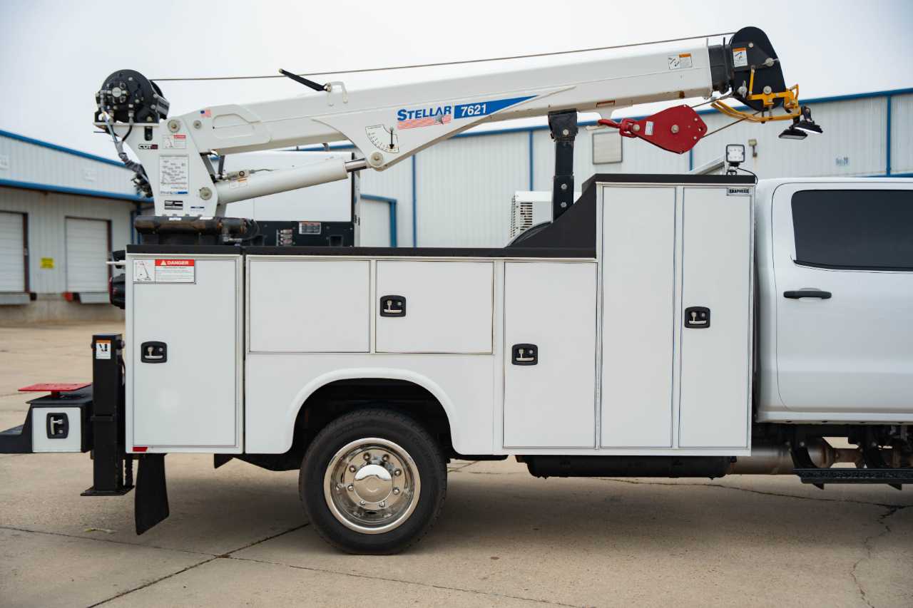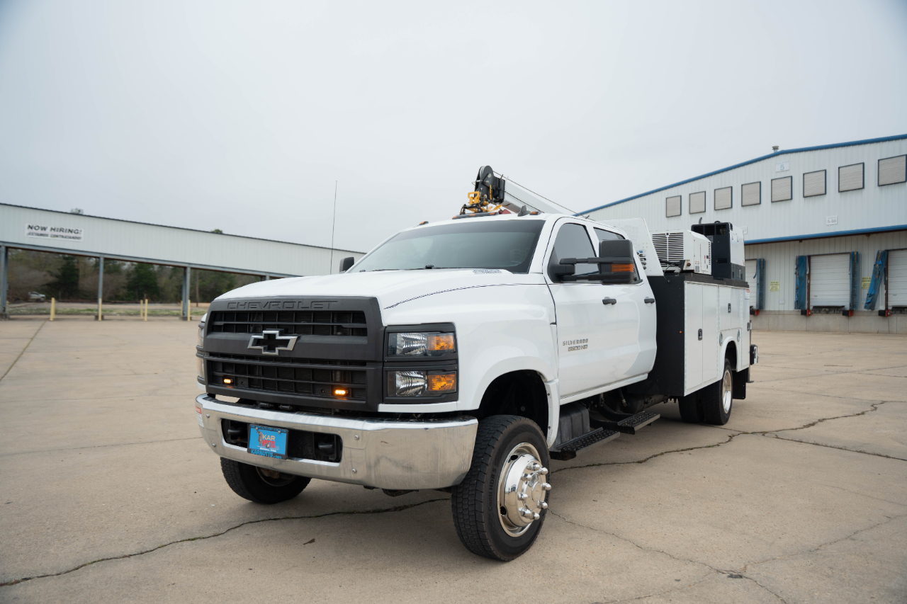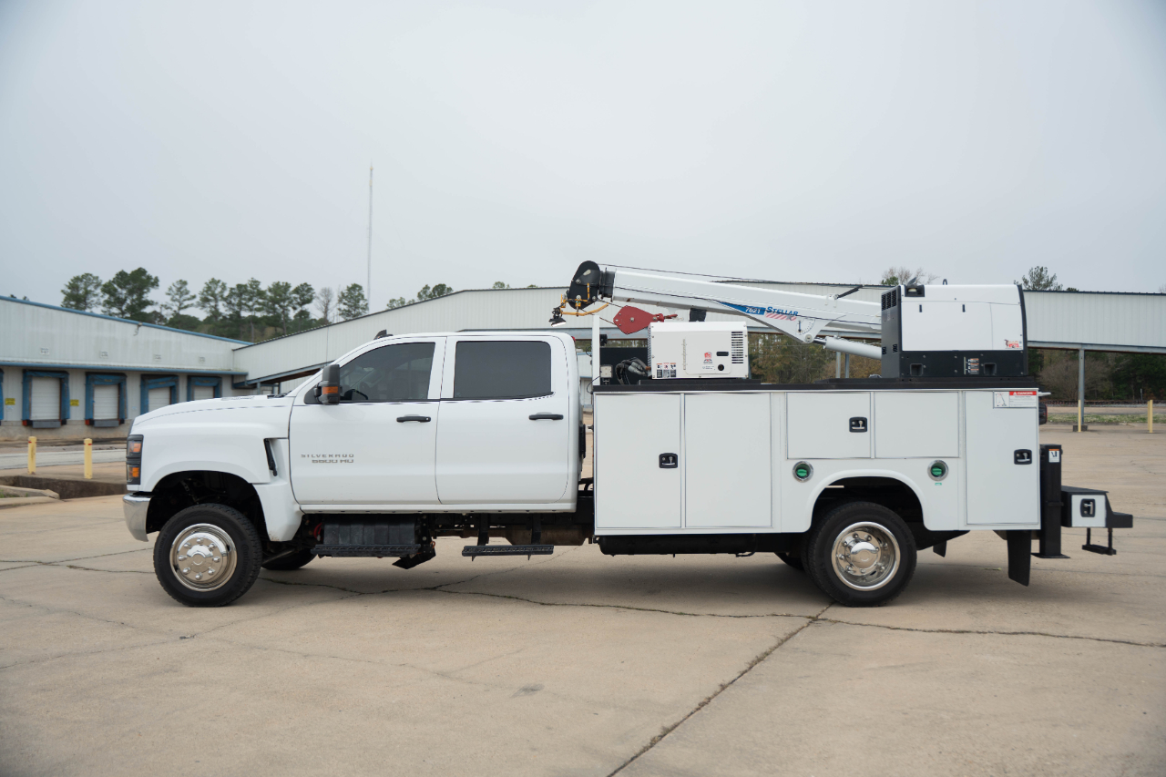 2022 Chevrolet Silverado 5500HD, 60,172 MILES, 4X4 4dr Crew Cab, Utility-Service Truck, 2022 Chevrolet Silverado 5500 HD Crew Cab, 4x4 Mechanics truck! Powertrain: Duramax 6.6L V8 Turbodiesel, 10-Speed Automatic Allison transmission, Autotrac 2-speed transfer case Capability: 19500 GVWR, Payload plus upgrade, max tow package, Manual locking Hubs, PTO provision, snowplow prep package. Ready for any challenge. Comfort & Convenience: A/C, tilt wheel, and an easy-clean vinyl floor, Power windows/locks, heated telescoping mirrors, and remote start, Bluetooth technology, 4G LTE Wifi capable Cruise Control, Upfitter switches Triple-sealed doors for minimal road noise. Safety Features: Anti-lock brakes, backup sensors, and durable skid plates. Mechanics Body: Knaphiede KMT1 -11Ft Bed Length, Bed Length of 133.25 , 45 overall cabinet height 60 raised Oxygen/Acetylene cabinet, 21 workbench with bumper storage with vice mount. -CTECH Rollout drawers capable of 400 LBS per drawer with adjustable shelving/dividers Crane: Stellar 7621 -21 Hydraulic reach, Boom Length 11 -7,500 LBS of lift capacity -400 Degree rotation -Wireless remote, digital display, overload protection -Hydraulic outriggers Located in MARSHALL Texas, FINANCING*, EXTENDED WARRANTY*, FREE AIRPORT PICKUP, AND NATIONWIDE DELIVERY AVAILABLE*