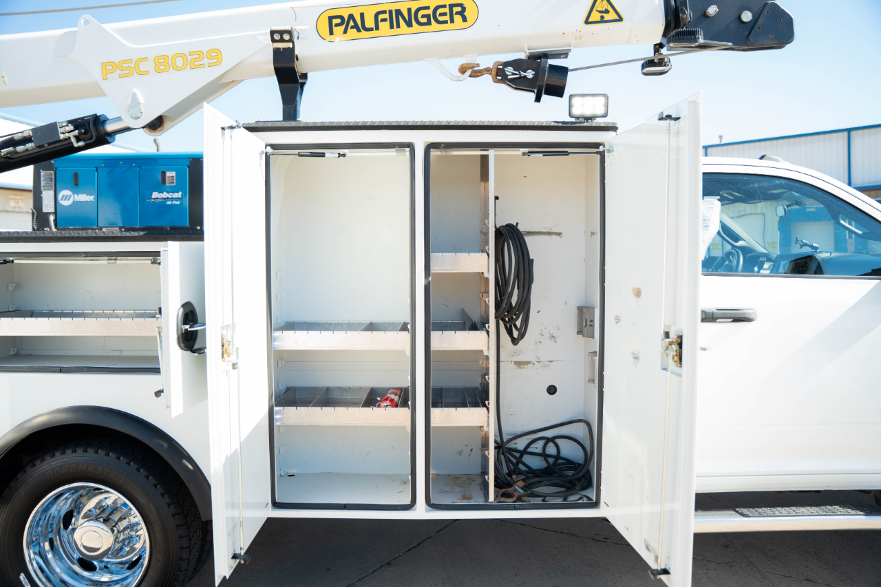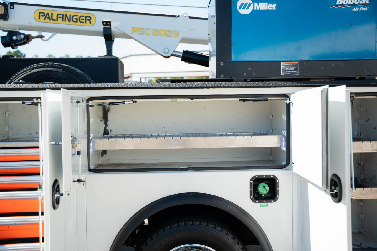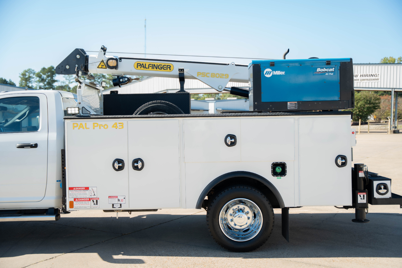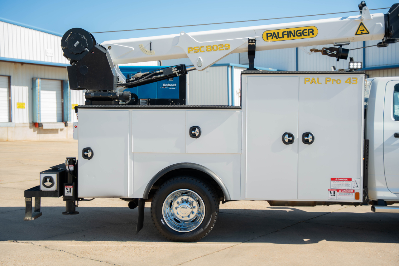 PAL Pro 43 service body: The Palfinger PAL Pro 43 mechanics body is optimized for weight to maximize payload without sacrificing durability. It is constructed with 12-gauge A-60 galvanneal steel, featuring a hybrid torsion box that prevents flexing and cracking under heavy crane use. The compartments are coated with Zolatone for superior corrosion resistance and are equipped with light-weight aluminum doors.