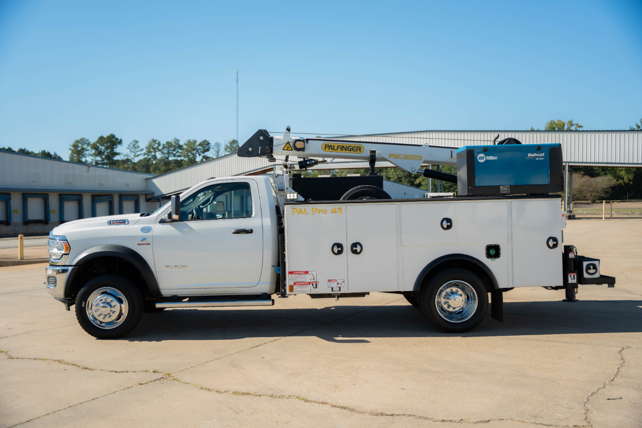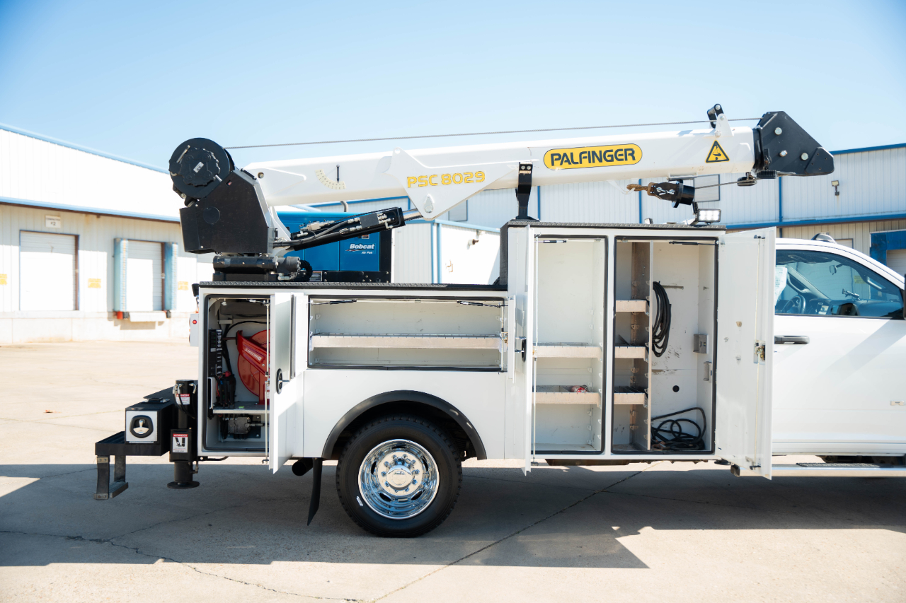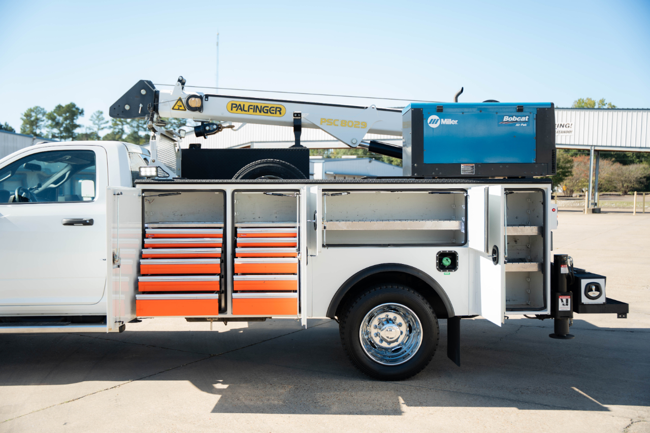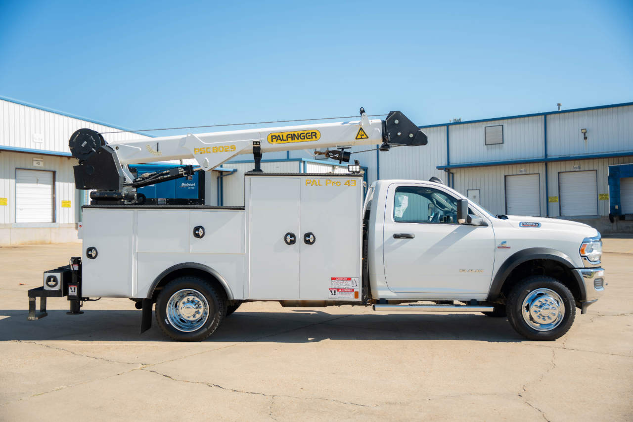 PAL Pro 43 service body: The Palfinger PAL Pro 43 mechanics body is optimized for weight to maximize payload without sacrificing durability. It is constructed with 12-gauge A-60 galvanneal steel, featuring a hybrid torsion box that prevents flexing and cracking under heavy crane use. The compartments are coated with Zolatone for superior corrosion resistance and are equipped with light-weight aluminum doors.