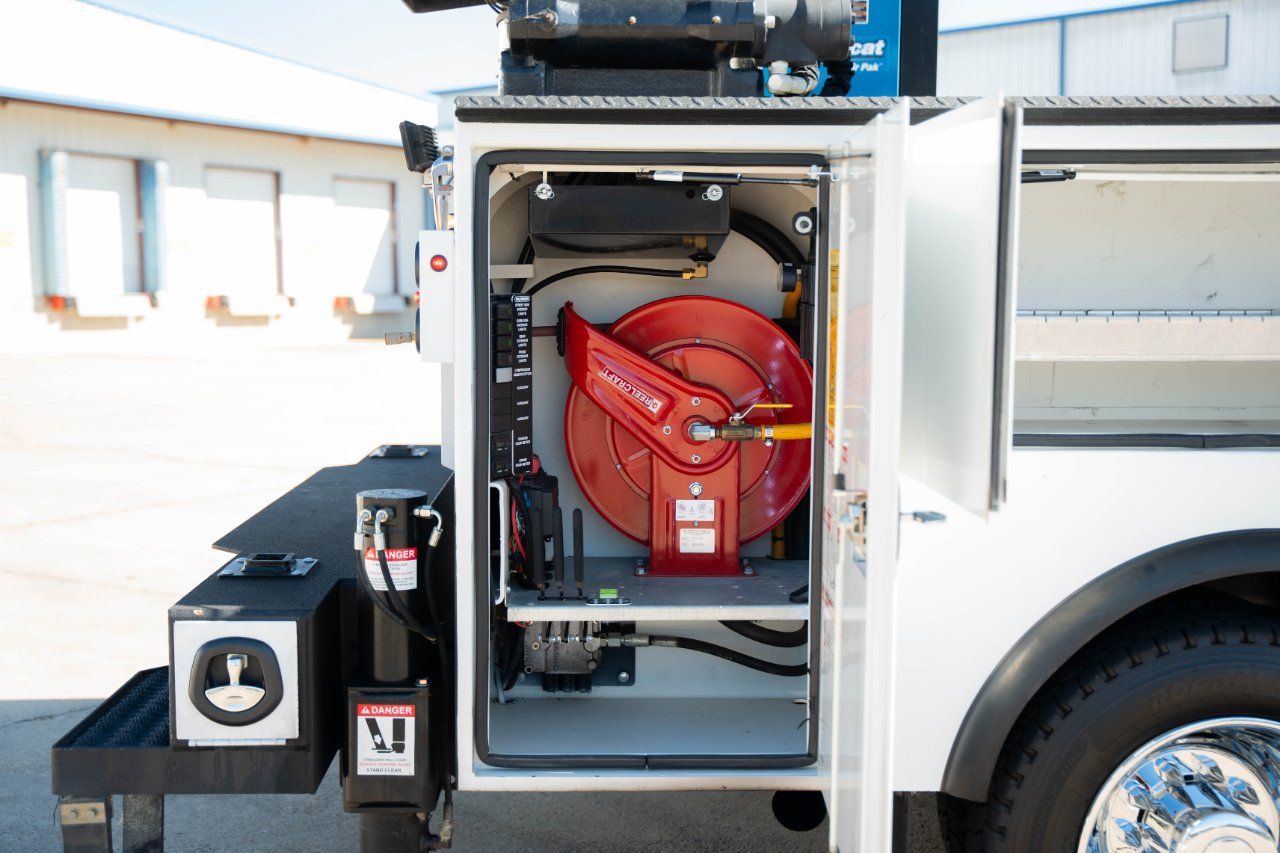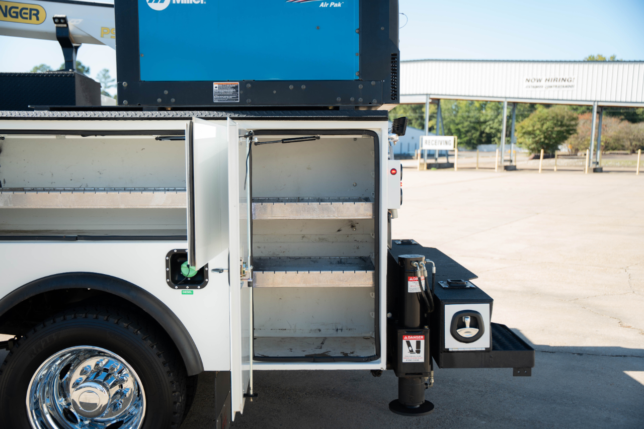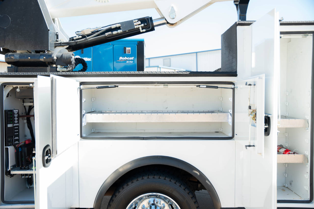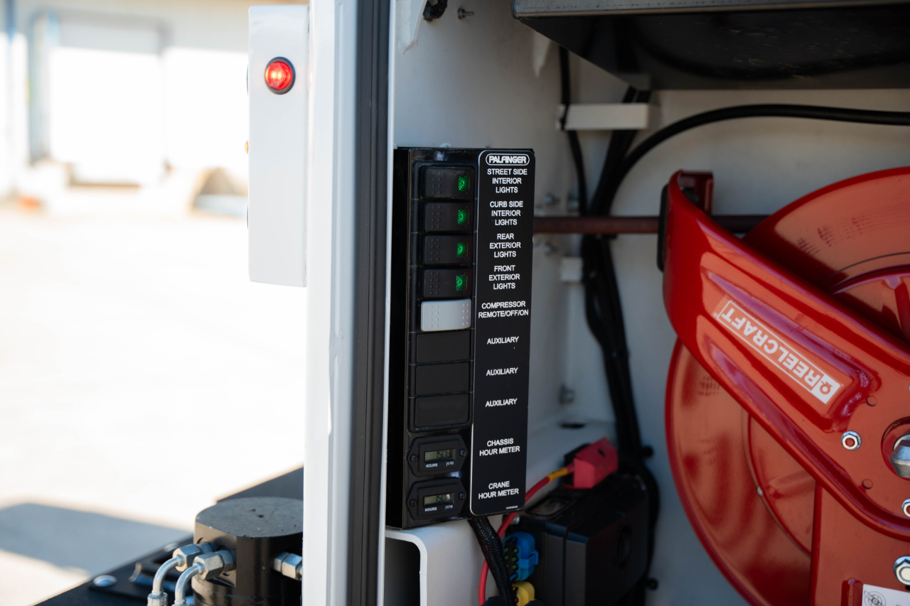 PAL Pro 43 service body: The Palfinger PAL Pro 43 mechanics body is optimized for weight to maximize payload without sacrificing durability. It is constructed with 12-gauge A-60 galvanneal steel, featuring a hybrid torsion box that prevents flexing and cracking under heavy crane use. The compartments are coated with Zolatone for superior corrosion resistance and are equipped with light-weight aluminum doors.