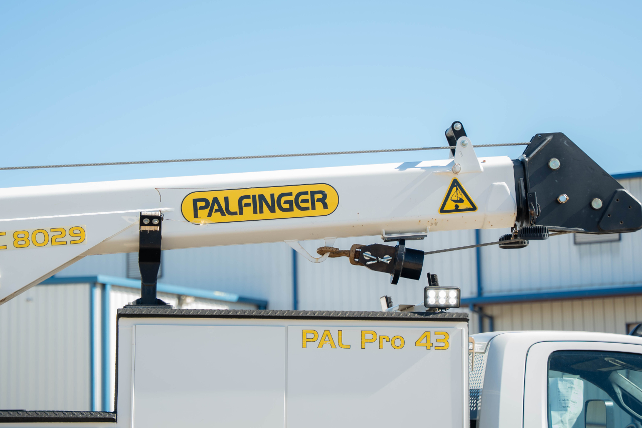 PSC 8029 crane: The Palfinger PSC 8029 hydraulic service crane features an 8,000 lbs lifting capacity and a generous 29.1 ft of outreach. Its telescopic design, e-coated finish, and high-speed planetary winch ensure reliable and efficient performance for lifting and positioning materials.