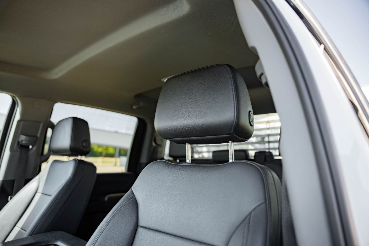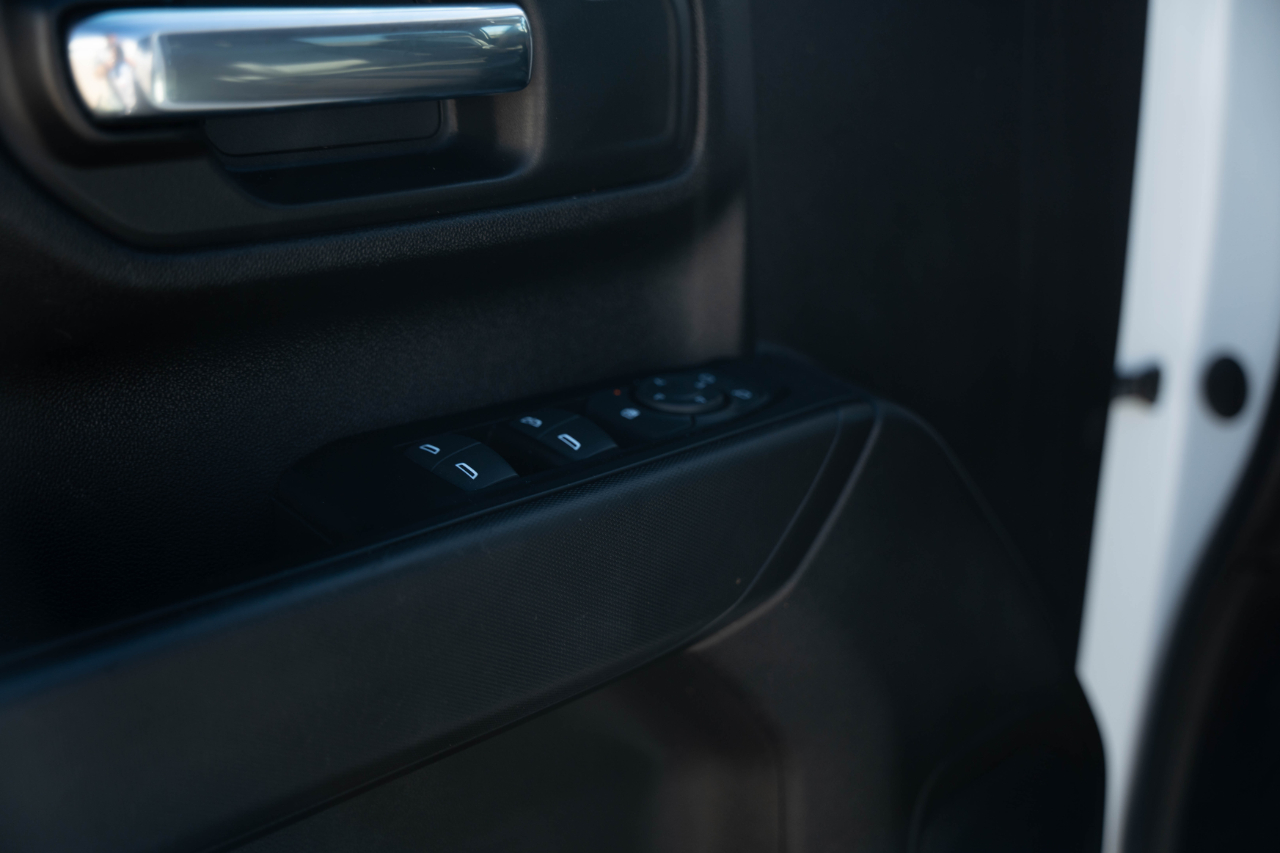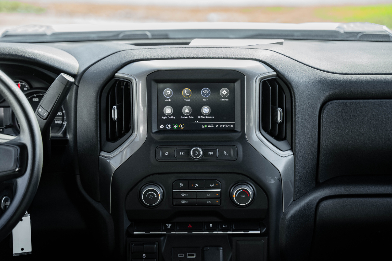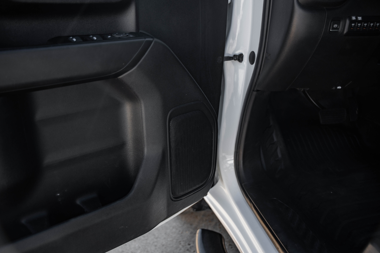 Interior & Exterior: A functional Crew Cab design with a durable black vinyl interior and a clean white exterior, ideal for a work environment.